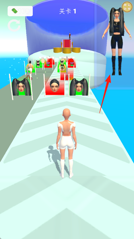 2、沿跑道前行,持续穿过匹配造型门,逐步换装,让角色外观接近终点目标造型。