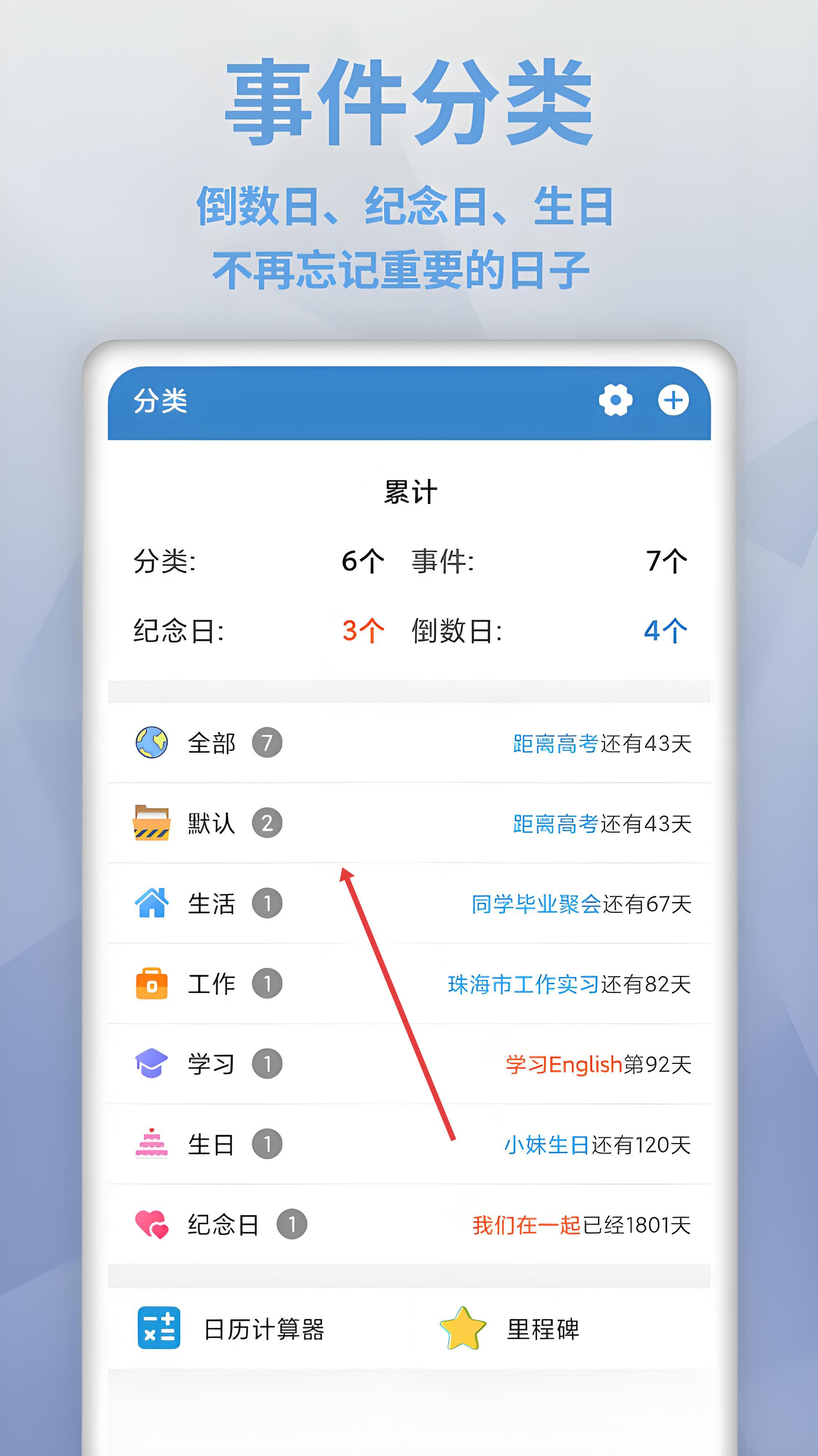 1、进入事件分类界面,可添加不同类型事件,点击“+”号,录入事件详情,借分类管理机制,梳理重要日子,体验有序记录生活的便捷,让关键日期不再遗漏。