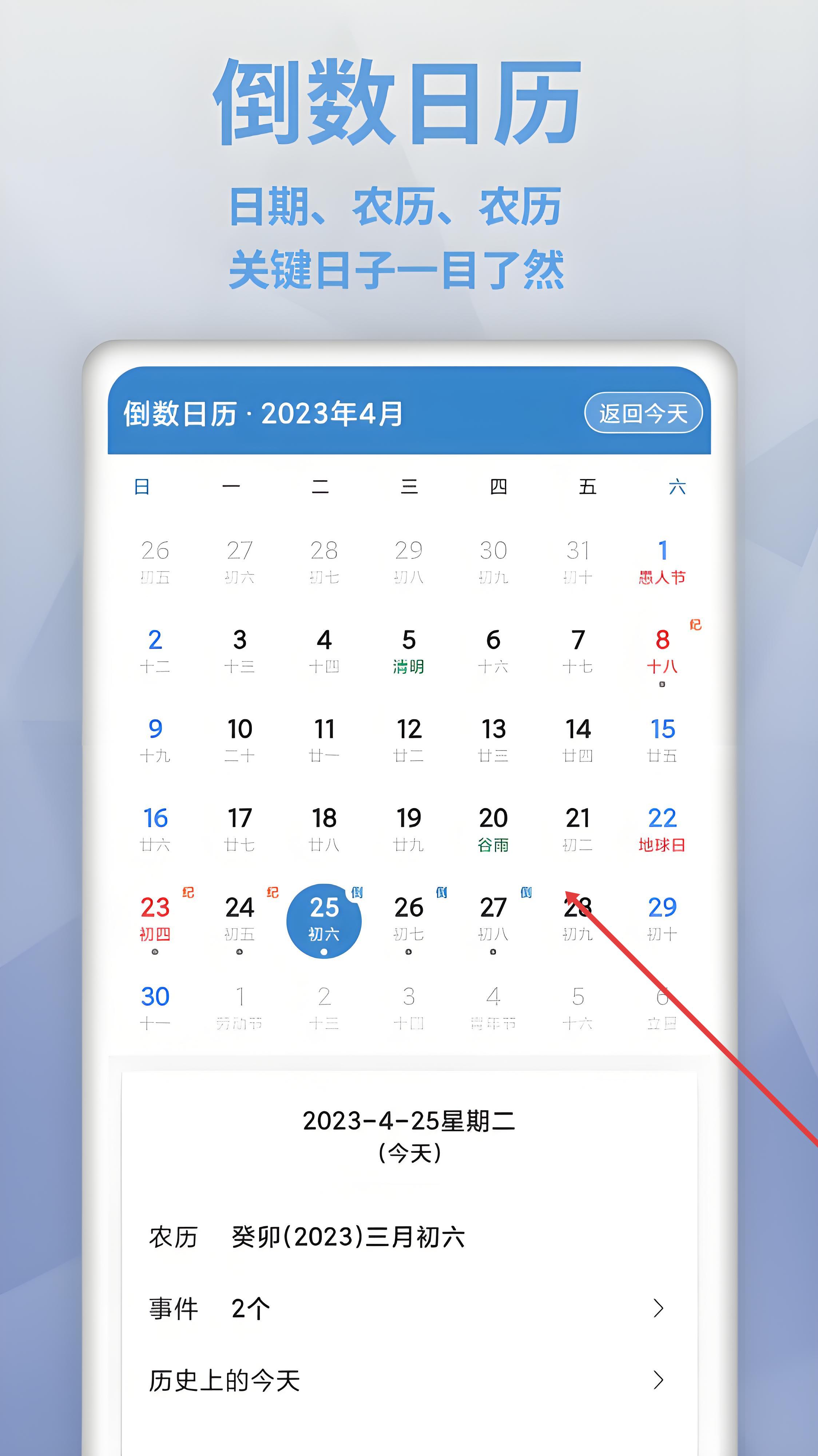 2、打开倒数日历界面,查看日期、农历信息,点击具体日期,可关联或查看当天事件,借日历联动机制,融合日期与事件,体验时间与事项结合的管理方式,清晰掌握每日安排。