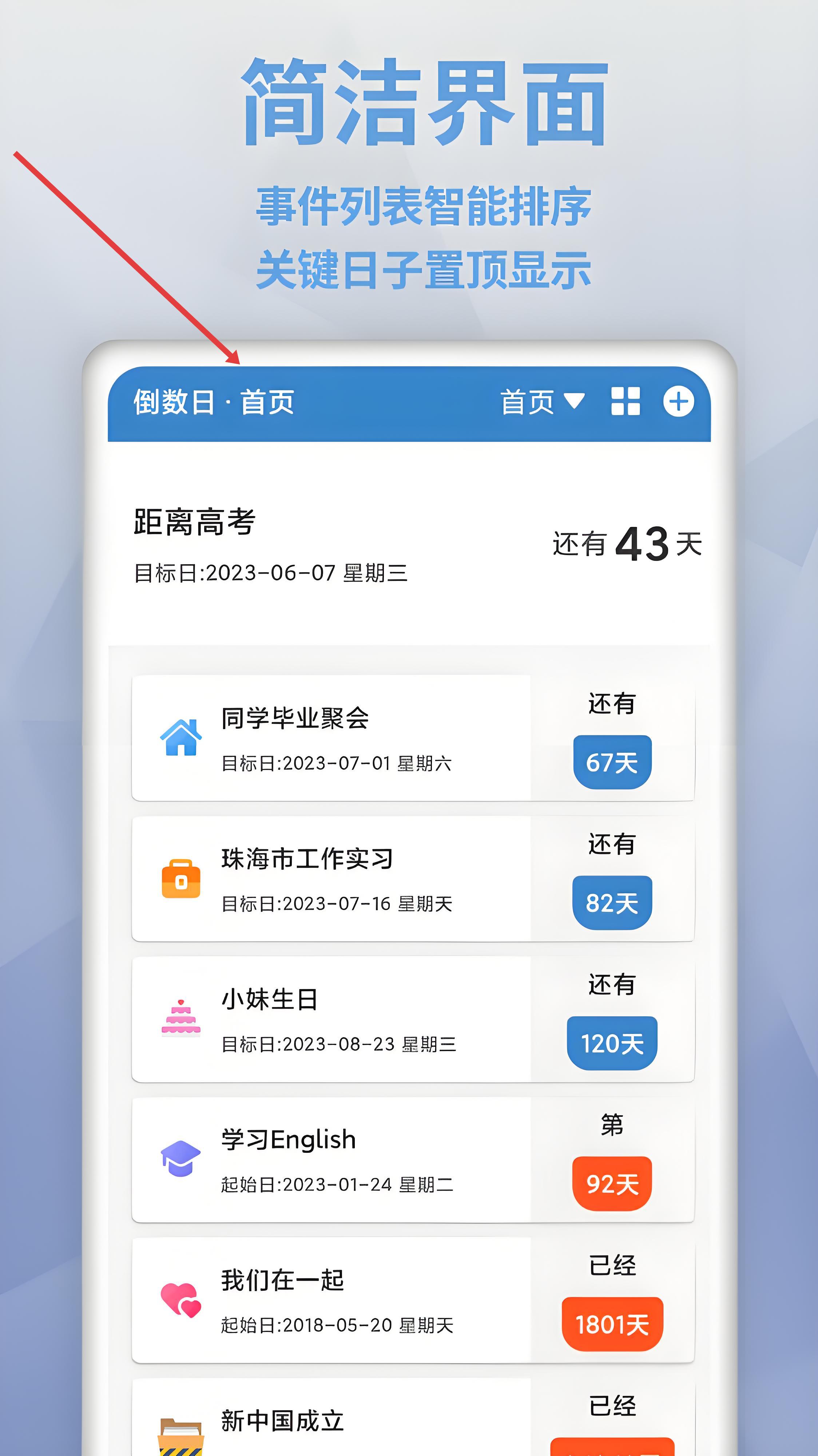 3、在简洁界面,事件列表智能排序,关键日子置顶,上下滑动浏览事件,点击事件可编辑或查看详情,优先关注重要日期,体验高效的信息呈现与交互,便捷管理生活节点。