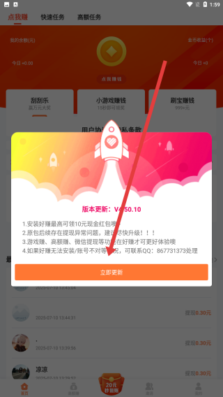 3、权限设置后,若有版本更新(V50.10),点击【立即更新】,获取新功能(如红包、修复优化),继续使用。