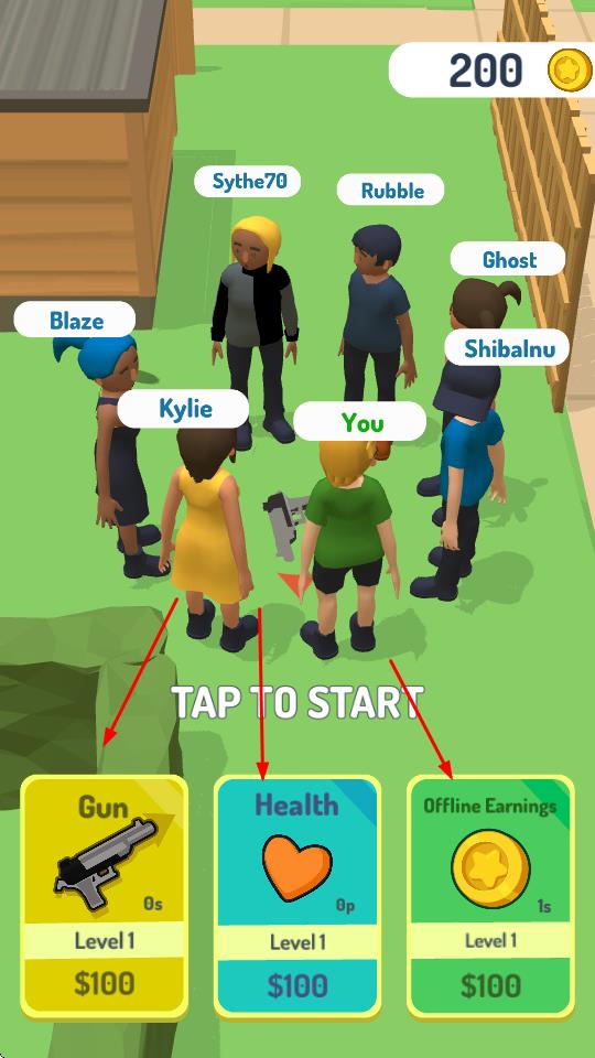 2、“角色养成”,用金币升级武器(Gun)、生命值(Health)、离线收益(OfflineEarnings),提升战斗力。