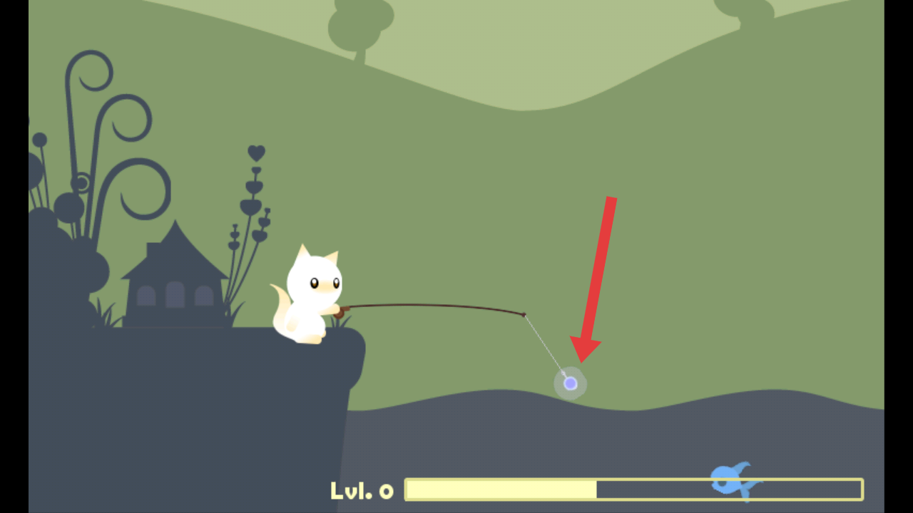 1、点击小猫钓线末端的紫色光点,触发钓鱼互动,通过钓取基础目标积累经验,助力等级提升。