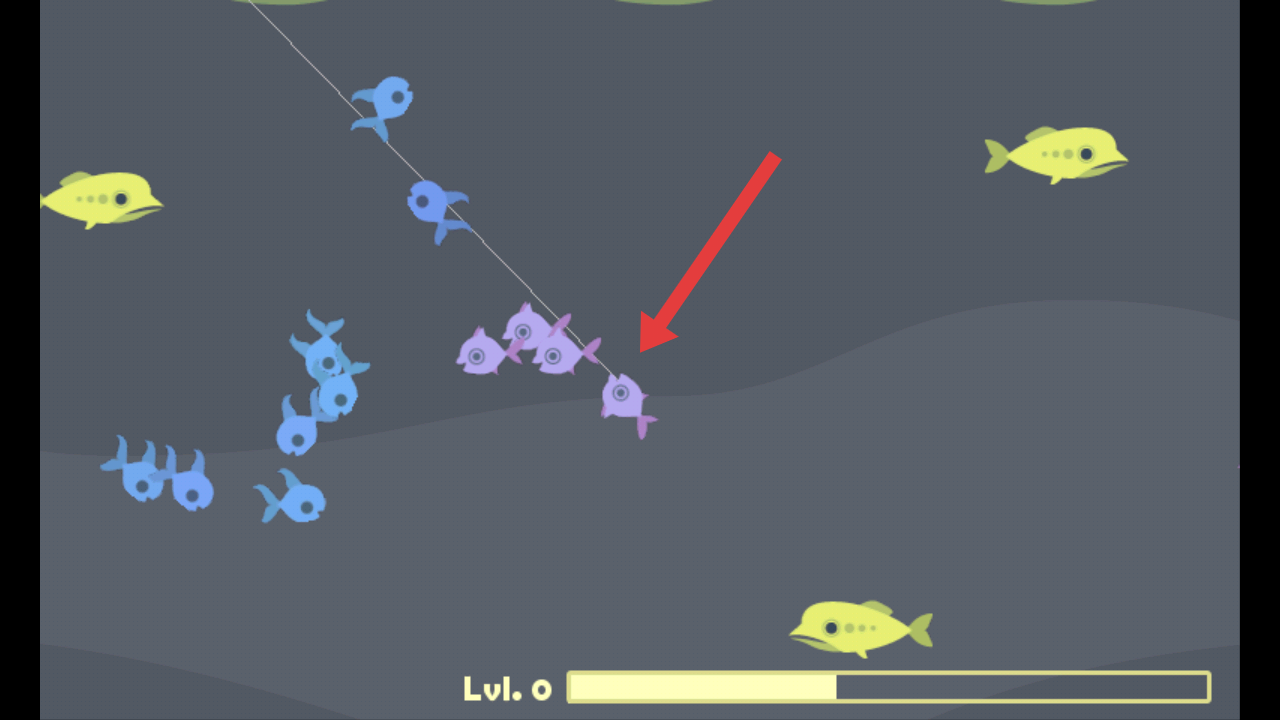 2、切换至水下视角后,瞄准游动的紫色小鱼点击钓取,持续积累钓鱼进度,为捕获更高等级目标做准备。
