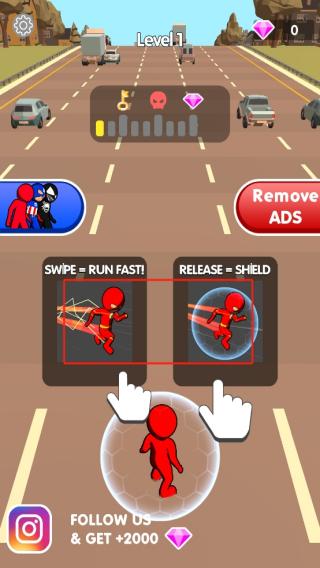1、跑酷对决结合:在赛道上操控英雄奔跑,灵活跳跃或转向躲避障碍物,遇到对手时及时出拳攻击将其击退,保持前进速度的同时赢得对决,向终点冲刺。