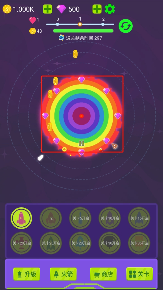 3、奖励升级解锁:利用通关获得的金币等奖励,升级火箭的攻击力与发射速度,同时解锁新的关卡,面对更多类型的星球,让摧毁体验不断升级。