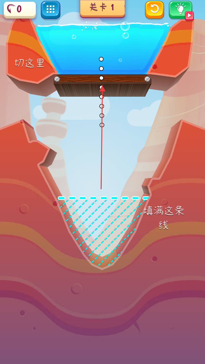 2、你需要通过滑动、点击等操作方式,切割木板,引导水源流动例如,在指定位置(如“切这里”标识处)切割木板。