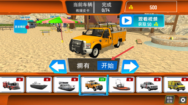 1、车辆选择:在车库选救援皮卡等车辆,点击“开始”进入驾驶场景。