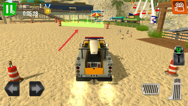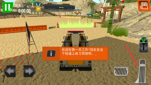 2、操作驾驶:用屏幕按键(方向、油门)控制车辆,在沙滩赛道行驶,按指引完成“第一天工作,练习驾驶”任务。