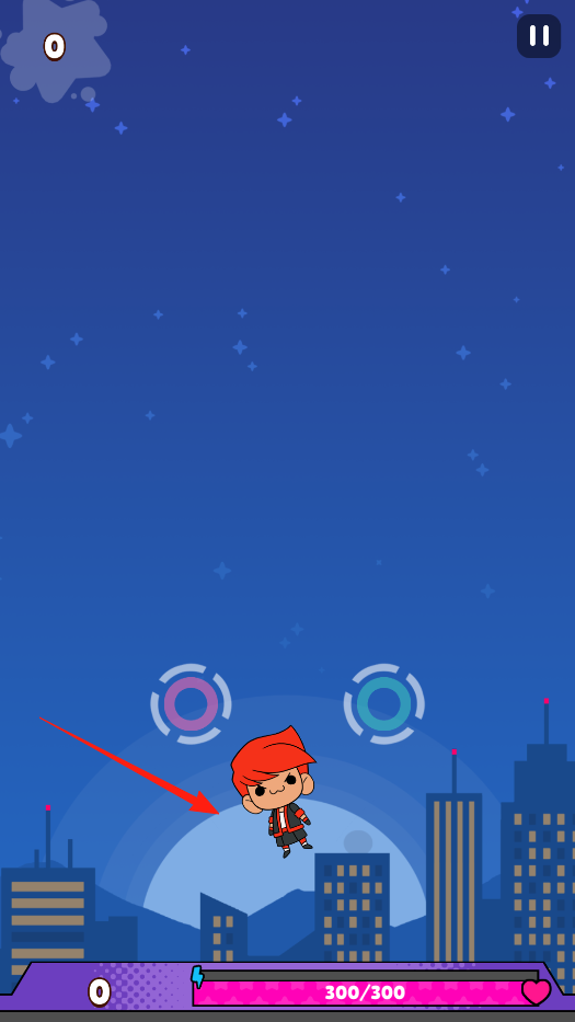 2、在游戏场景中,操控角色在空中移动,下方有两个环形标识,借跳跃或移动机制,让角色下落时靠近目标区域,体验平台跳跃玩法的基础操作,感受角色移动与场景互动的乐趣。