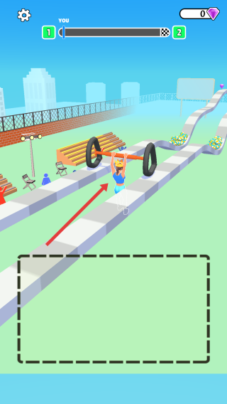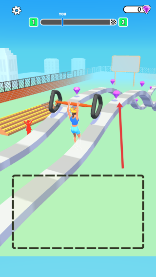 2、道具升级:轨道生成后,角色杠铃变为带轮道具,沿轨道滚动,收集路上物品(如紫色钻石)。
