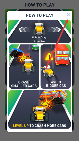 1、在玩法指引页,掌握“Hold&Drag”操控、撞小车躲大车规则后,点击关闭按钮,进入游戏实操。