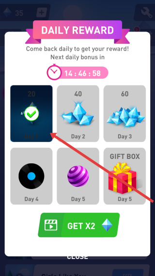 2、进入每日奖励界面,Day1已完成领取(20钻石),后续保持登录,到对应天数领更多奖励,可看广告双倍获取。