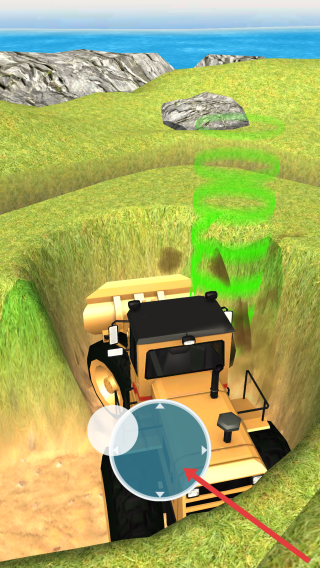 2、在游玩中,通过虚拟摇杆控制工程车移动,在草地场景挖掘路径,避开障碍,按绿色轨迹推进,完成关卡地形改造。