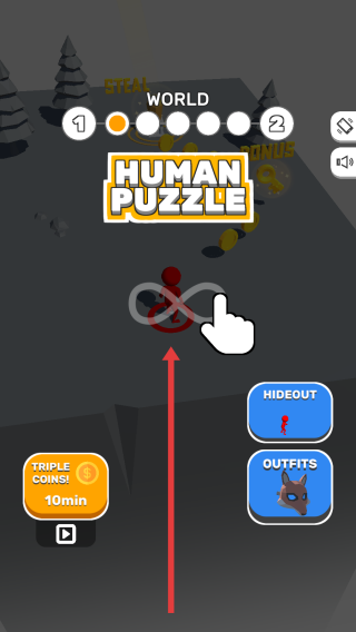 1、在游戏启动页,点击红色角色位置,进入《Human-Puzzle》关卡,可查看【HIDEOUT】【OUTFITS】等功能,准备开始冒险。