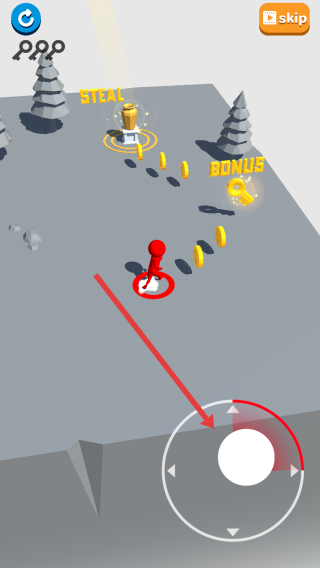 2、在游戏中,操控红色角色,通过虚拟摇杆移动,在场景收集金币,前往“STEAL”“BONUS”区域,完成奖励任务。