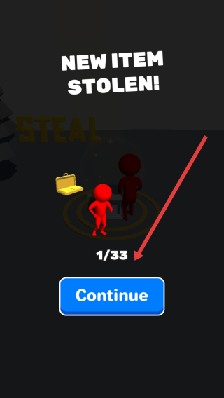 3、成功窃取物品(NEW-ITEM-STOLEN!1/33)后,点击【Continue】,继续下一阶段,推进游戏进度,解锁更多内容。