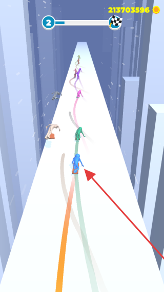 2、比赛中,引导蓝色角色(箭头指向 )沿彩色路径滑行,超越对手,冲向终点。