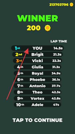 3、冲线后,若获【1st】名次(显示YOU),领取金币,点击继续,挑战新赛道。