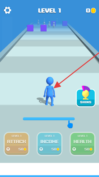 1、在【LEVEL1】,操控蓝色角色,可升级【ATTACK】【INCOME】【HEALTH】,强化能力后出发。
