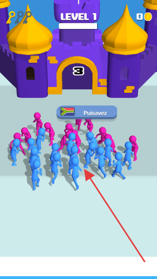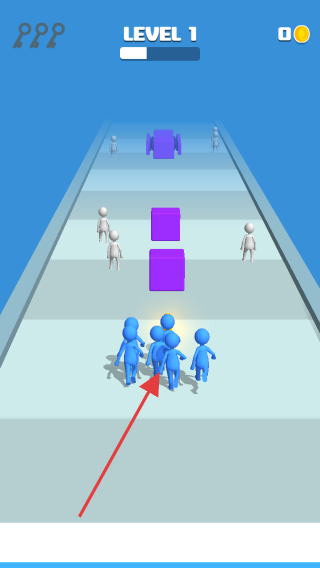 2、沿跑道前行,蓝色角色吸引同伴(箭头指向),壮大队伍,同时躲避紫色障碍。