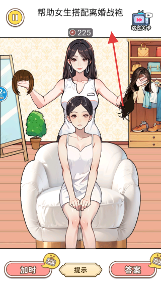3、在换装关卡,注意剩余时间(225),点击箭头提示的操作区域,合理搭配发型、服装,可使用“加时”“提示”“答案”功能辅助,完成搭配挑战,推进游戏进程。