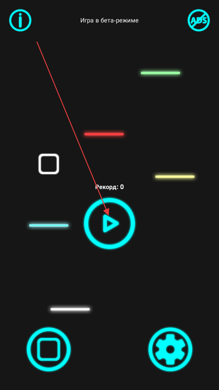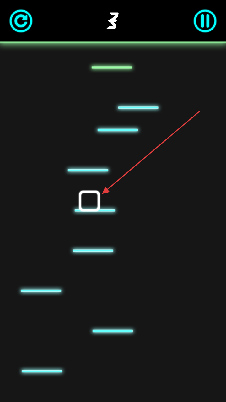 1、点击主界面蓝色播放键“开始”游戏,控制白色方块(角色)在霓虹线条构成的路径上移动。