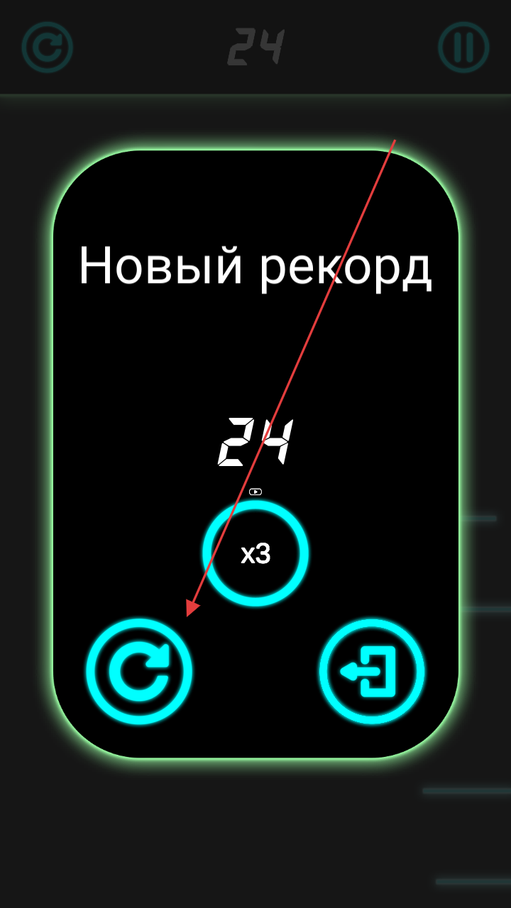 3、结束后,显示“Новыйрекорд”(新纪录)及分数,可点击重新开始按钮(左侧循环箭头)再来一局,挑战更好成绩。