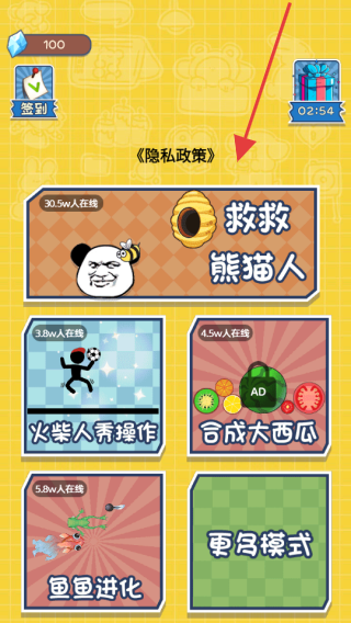1、在游戏选择界面,点击【救救熊猫人】,进入第1关第10小关,该游戏有“火柴人秀操作”“合成大西瓜”等其他模式入口。