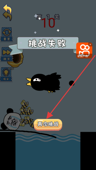 3、若挑战失败(如熊猫人掉落、被蜜蜂攻击等),点击【再次挑战】,重新尝试绘制路径,调整策略,直至成功通过关卡,可使用“重置”“提示”功能辅助。