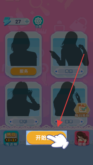 1、点击【开始】,选择服务角色(如“硬寒”),消耗资源(当前27)开启服务流程,可通过“设置”“每日签到”等功能获取资源。