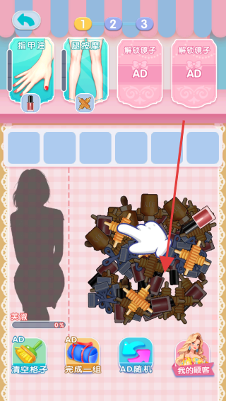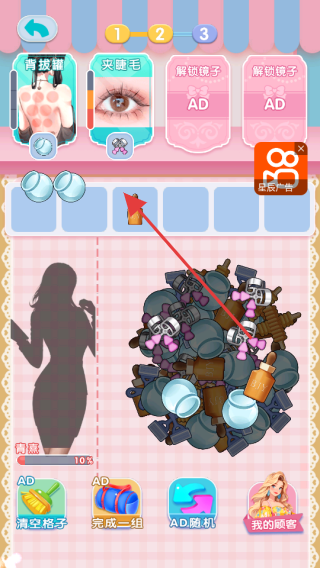3、持续合成道具,解锁更高级服务(青拔罐、夹睫毛等),将合成好的道具拖入上方空格,为顾客提供服务,推进游戏进程,可利用“AD随机”“我的顾客”功能优化体验。