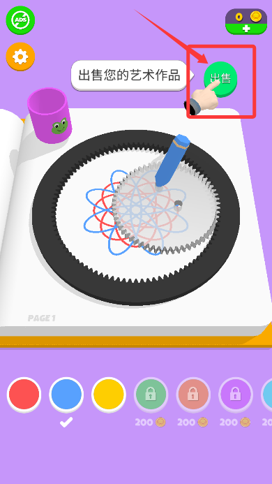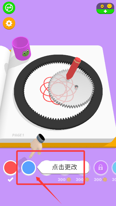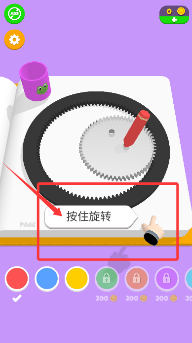 1、启动游戏后,长按旋转区域可以启动机械齿轮带动彩笔作画。