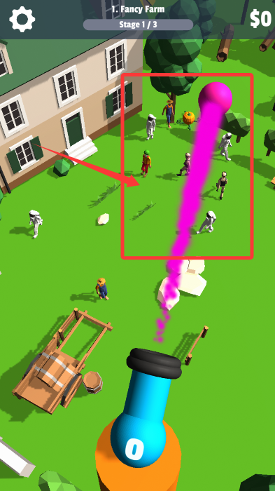 2、松开手指投掷粉色爆弹,观察被击中人群的趣味变形效果。