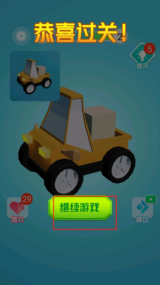 3、关卡通关后,点击绿色“继续游戏”按钮,进入下一关卡,持续积累拼装经验,解锁更多模型挑战。