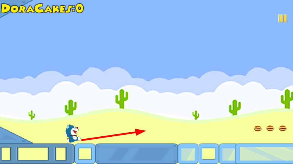 1、点击开始游戏进入后操控蓝胖子在初始场景中熟悉移动和跳跃的操作,收集铜锣烧,开启冒险之旅。