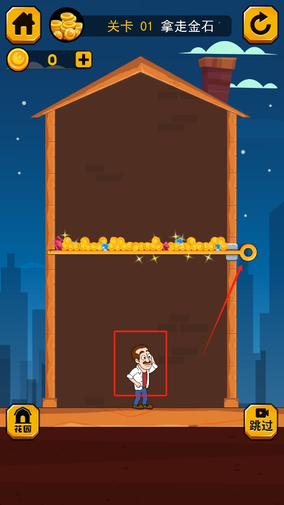 1、这里我们观察场景,点击右侧横向钥匙,让上方金币等掉落,注意时机,确保角色在下方安全接住掉落物,顺利拿到金石通关。