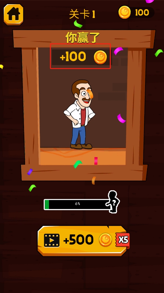 2、获胜后可直接领取100金币,或看广告获500金币×5奖励,积累金币用于解锁服装、道具等,助力后续关卡挑战。