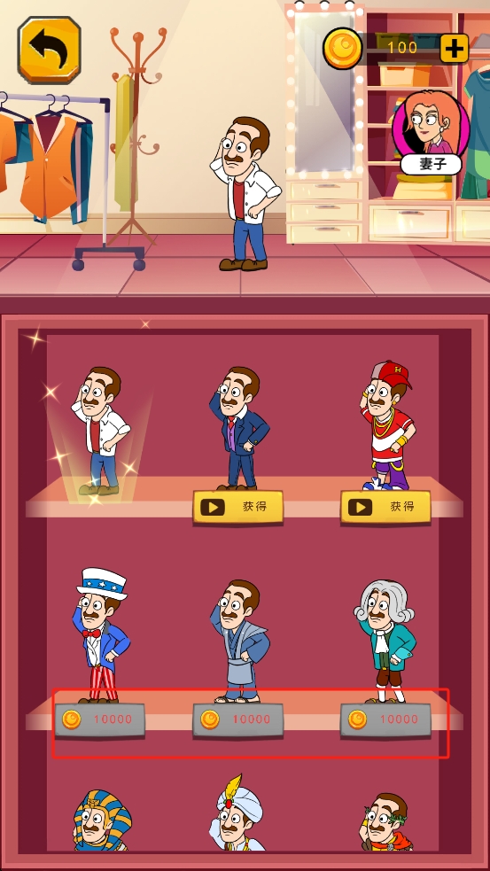 3、当我们金币够10000时,点对应服装的金币按钮可解锁新装扮,用不同风格服饰改变角色外观,也可看广告快速获取金币解锁。