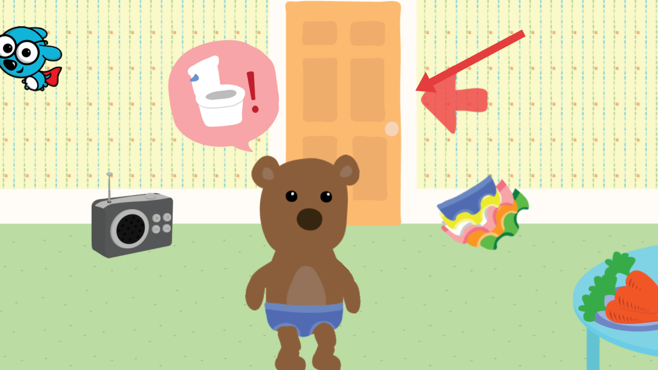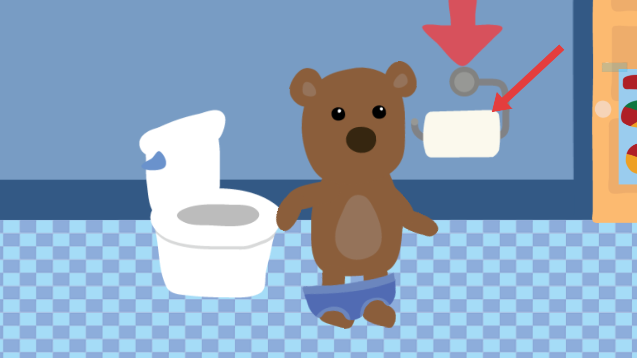 1、观察小熊上方气泡里的马桶图案与感叹号,跟则红色箭头的指引朝向房门移动,前往提示指向的区域。