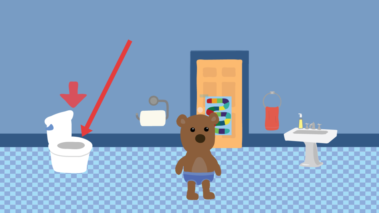 2、跟随指引操控角色进入卫生间,点击红色箭头标注的马桶,触发泰迪熊上厕所的互动机制。