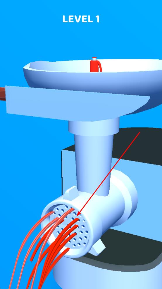 2、红色物体通过机器,从出肉口挤出,完成绞制,注意观察流程。