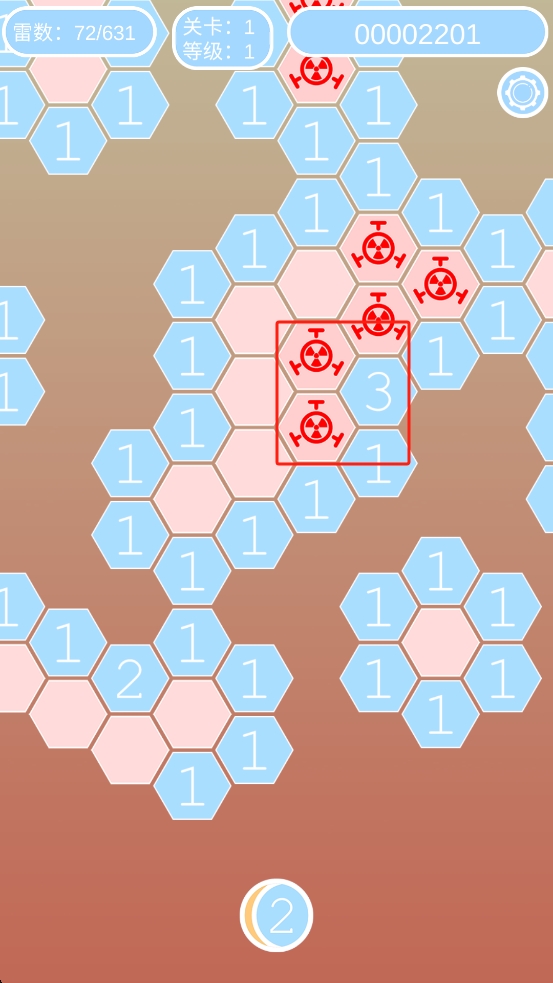 1、六边形棋盘设计:突破传统方形格子,采用六边形布局,每个格子的相邻格数量更多样,雷数计算逻辑更复杂,为经典扫雷注入新鲜变化,避免玩法固化。