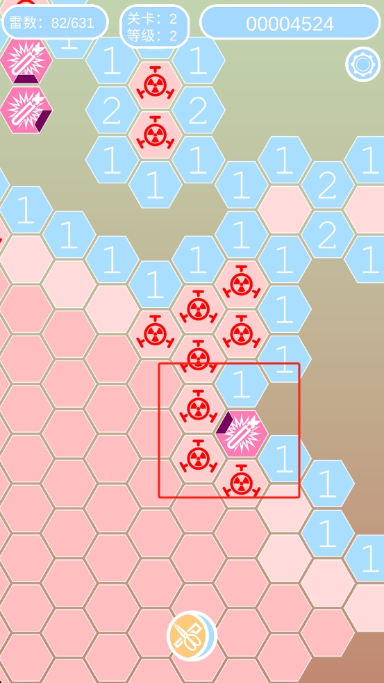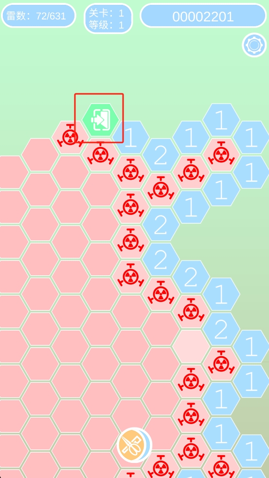 1、格子点击判断:点击六边形格子尝试翻开,若为数字则显示周围六格内的地雷数量,若触雷则关卡失败,通过数字信息逐步排除安全区域。