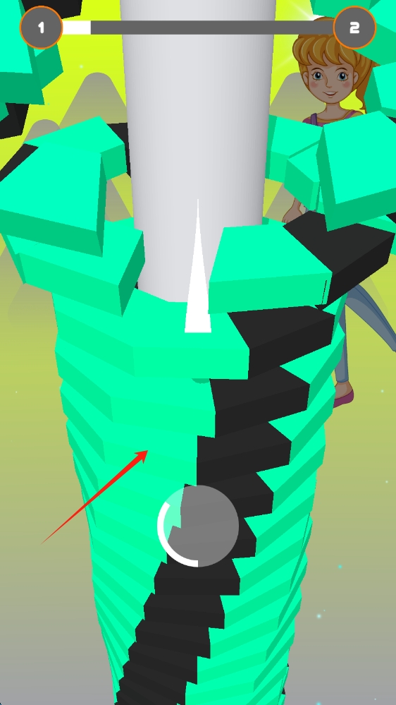 2、游戏进行中,球体下落击碎彩色障碍物,需避开黑色部分,上方进度条显示 “1→2”,按住下落。