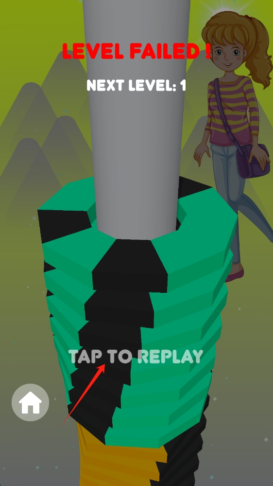 3、关卡失败画面,显示 “LEVEL FAILED!”(关卡失败 )、“TAP TO REPLAY”(点击重玩 ),延续堆叠、点击重开。