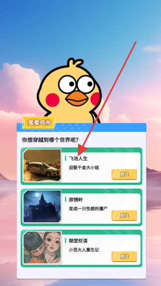 1、在游戏世界选择界面,根据喜好点击【飞池人生】等选项进入对应世界开启冒险,不同世界有独特剧情和玩法,选对世界可提升游戏体验。