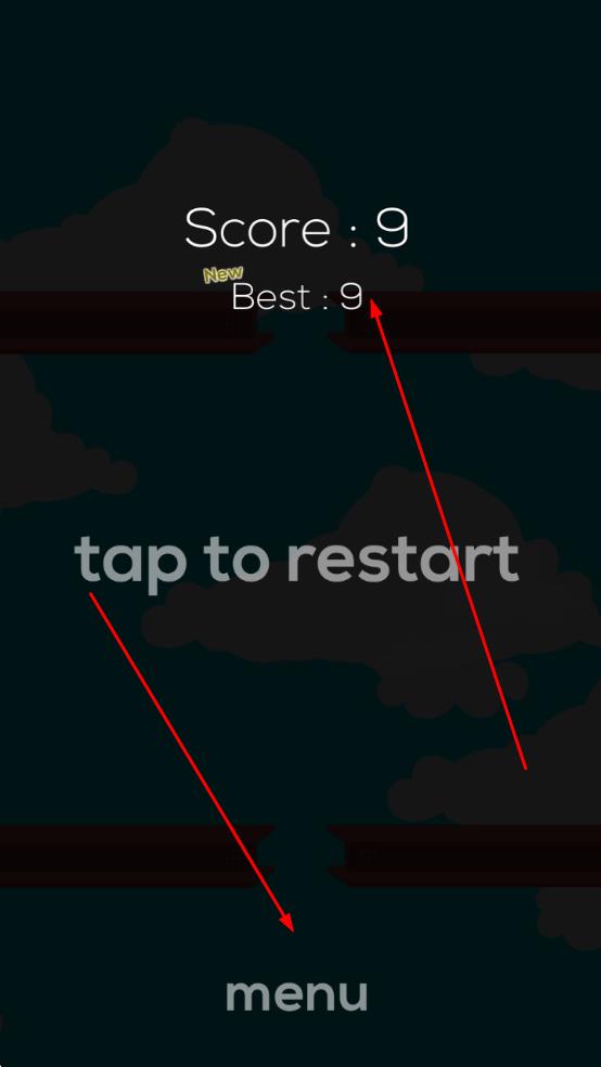 3、失败后,查看【Score:9】,点击【tap to restart】重玩,或回主页。