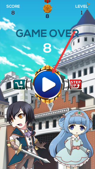 3、公主被怪物碰到就算游戏结束,需要点击箭头所指蓝色播放按钮,重启挑战,冲击更高成绩。