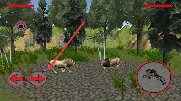 3、进入战斗场景,通过左下角的左右键控狮子移动,当敌对狮子靠近时,点击右边技能图标攻击。